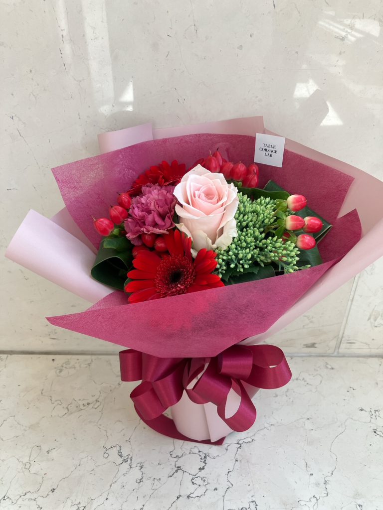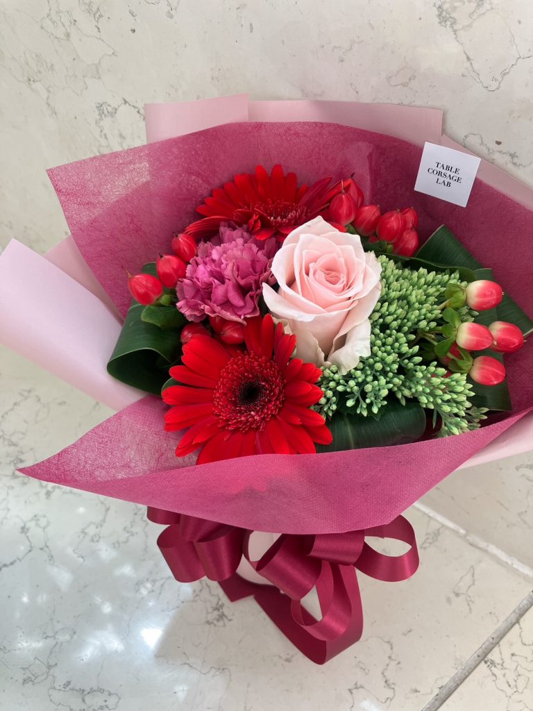 赤×ピンクの華やかな色合いのブーケです♪