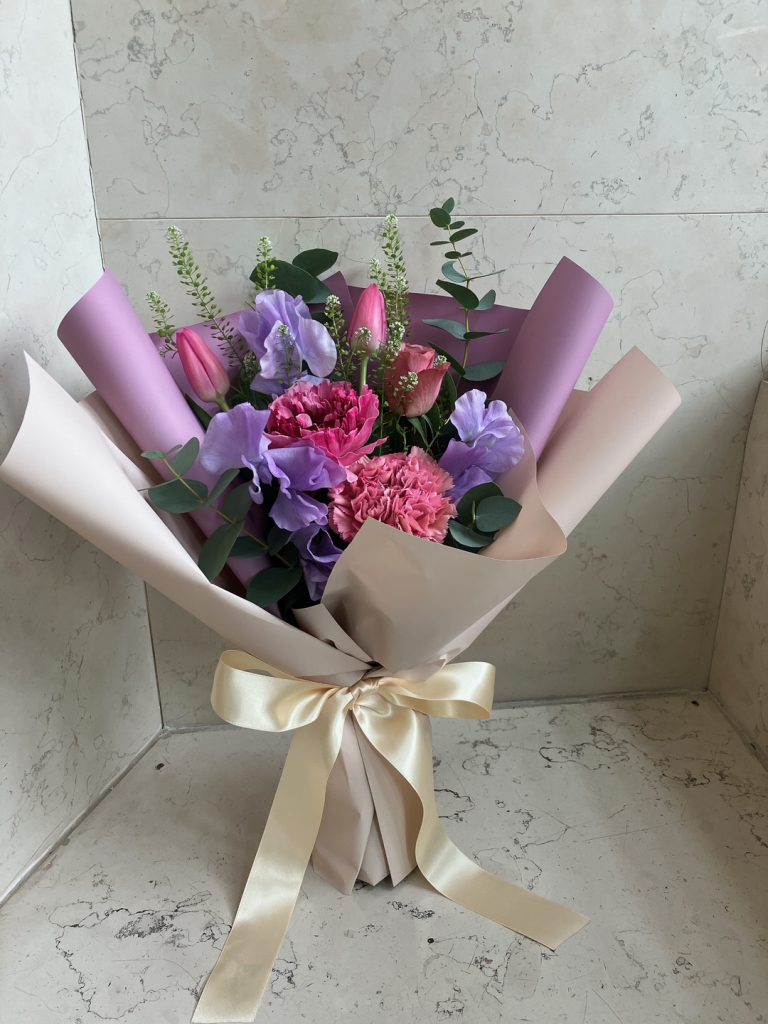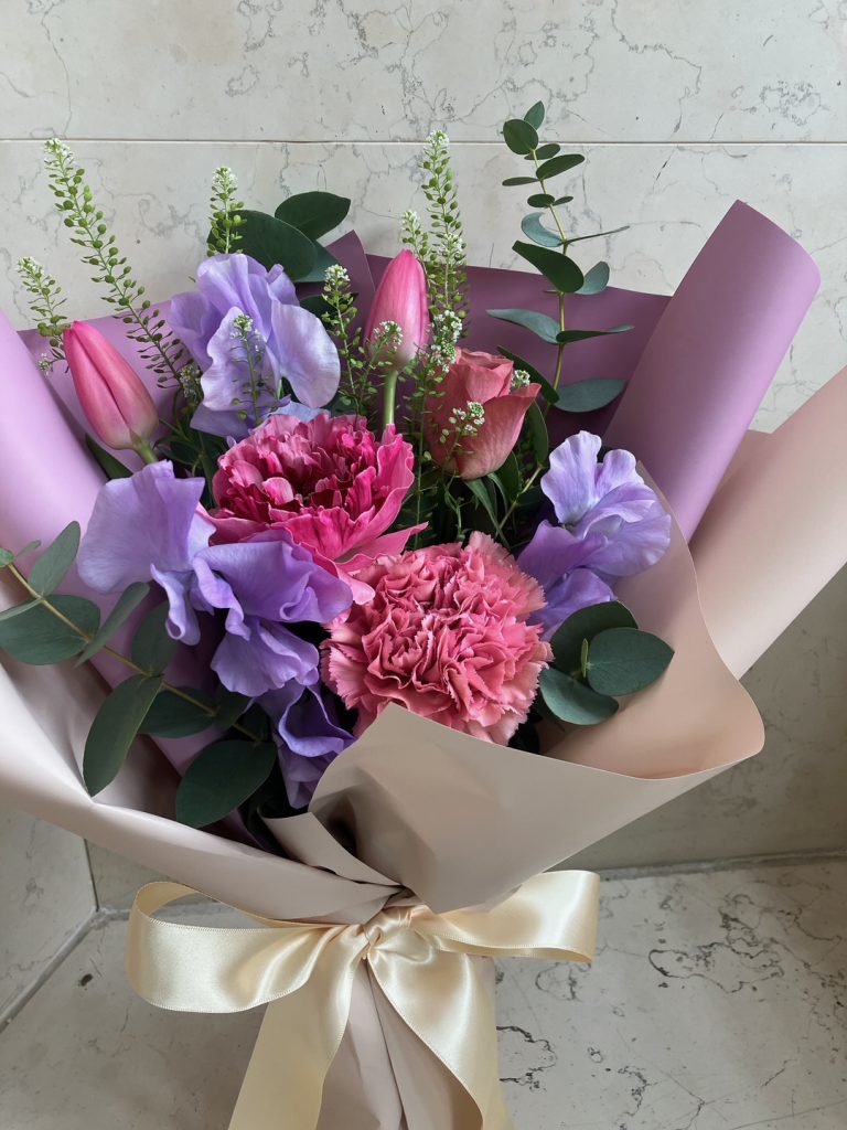 季節限定 チューリップやラナンキュラス、スイートピーを組み合わせて ピンク~パープル系でお作りしました大人かわいいお花束です♪