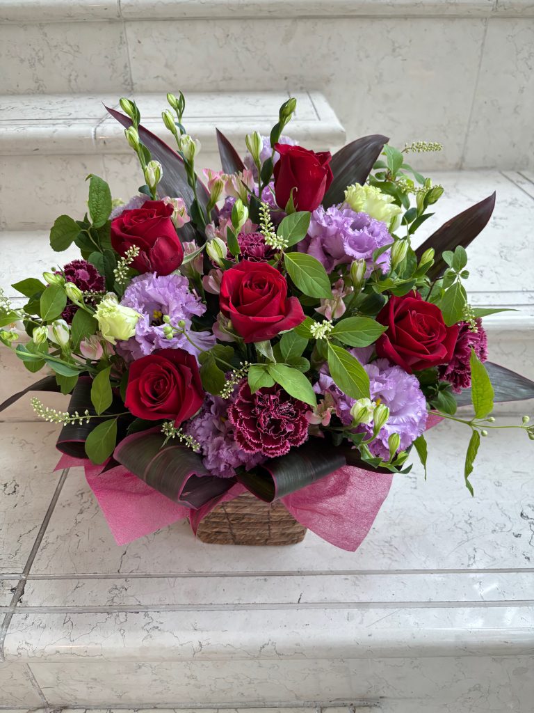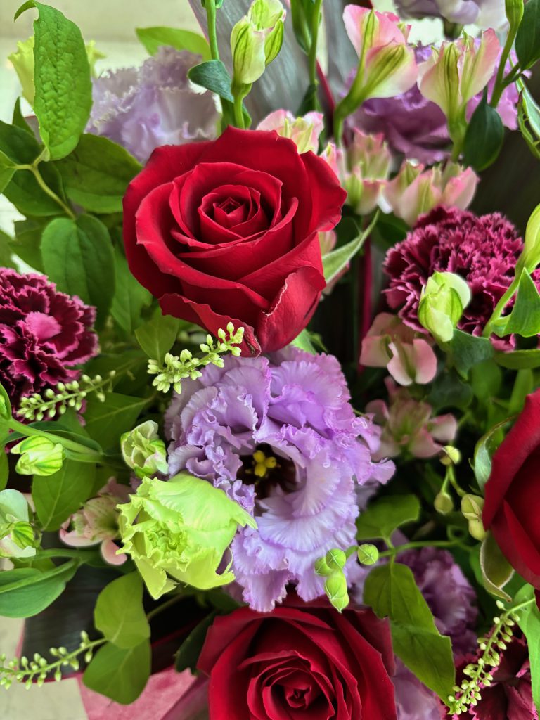 赤いバラを主役にムラサキ色の花を合わせたアレンジメントです。