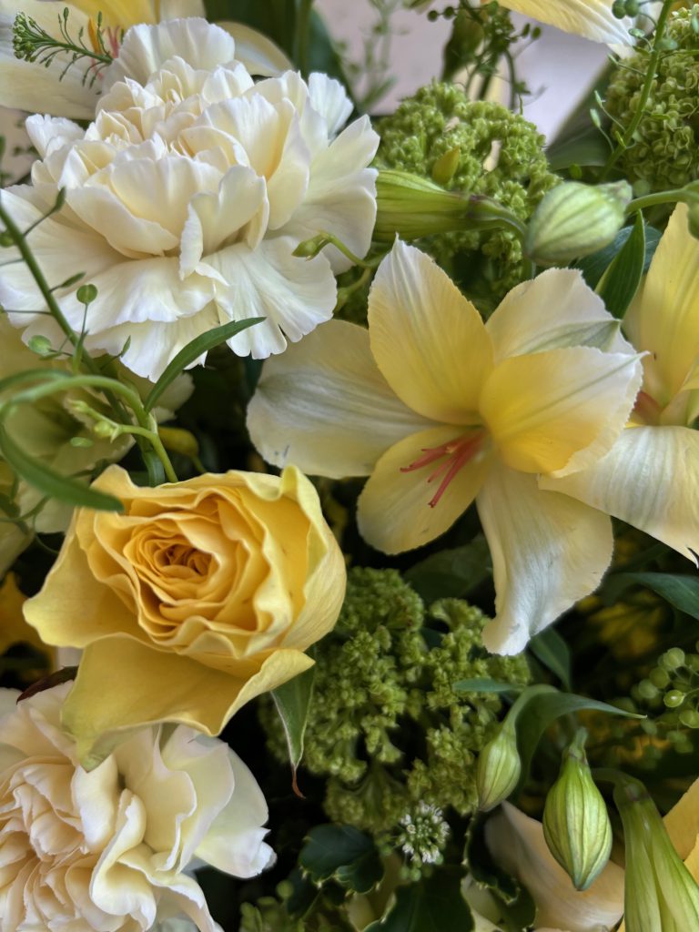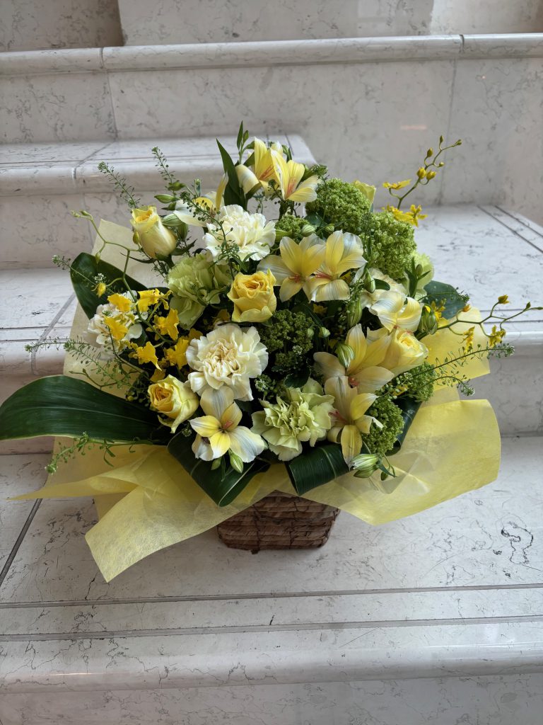黄色の濃淡の色合いにグリーンが差し色の爽やかなアレンジメントです。