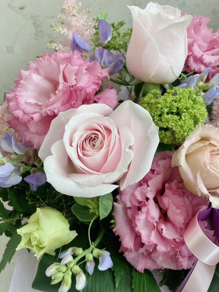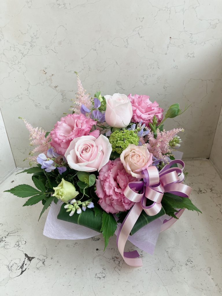 淡いピンクパープルの上品な色合いのアレンジメント。