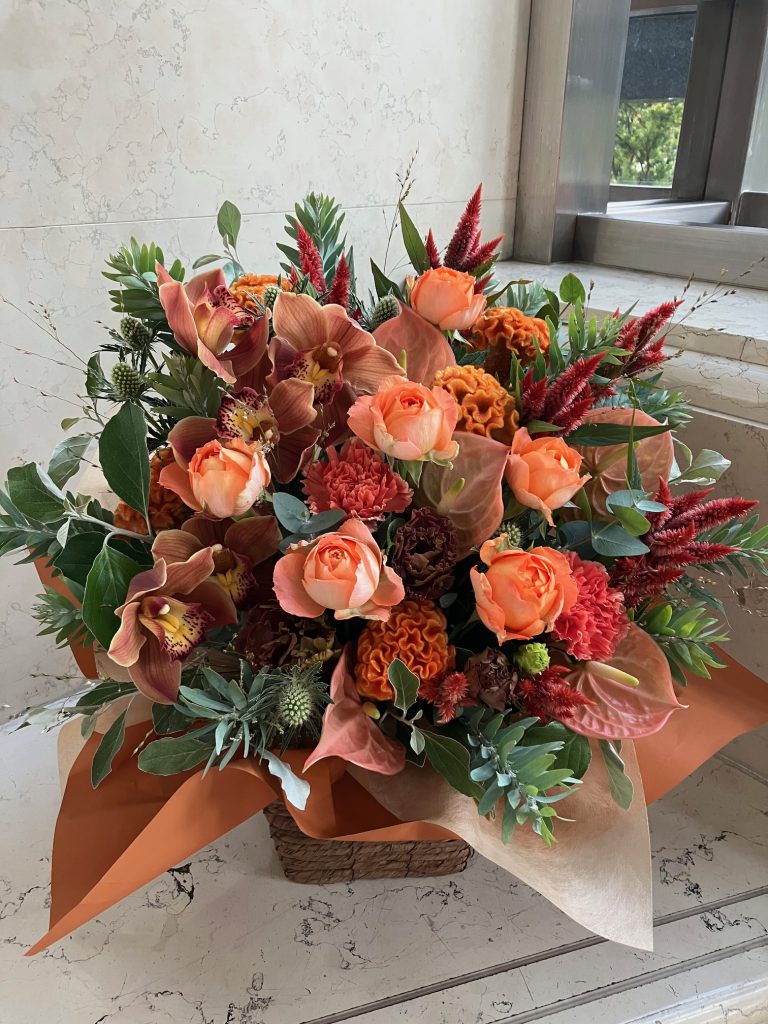 オレンジ~ブラウンの落ち着いた色合いのアレンジメントです♪