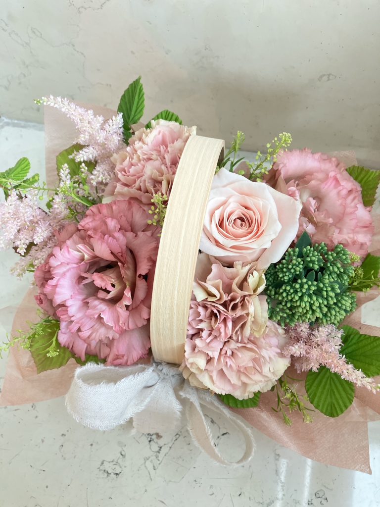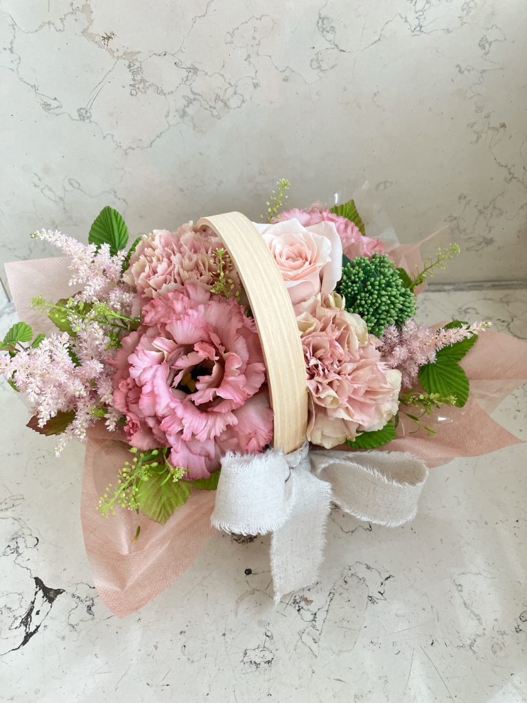 可愛らしいピンク系のアレンジメント! お誕生日、記念日など贈り物に人気です♪