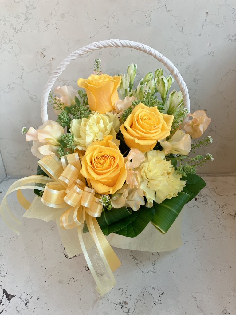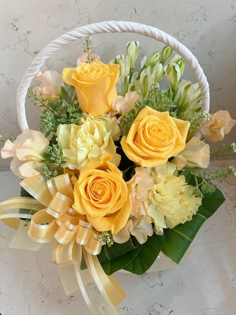 明るく可愛らしいイエロー系のお花を ハンドル付きのホワイトバスケットにアレンジしました♪