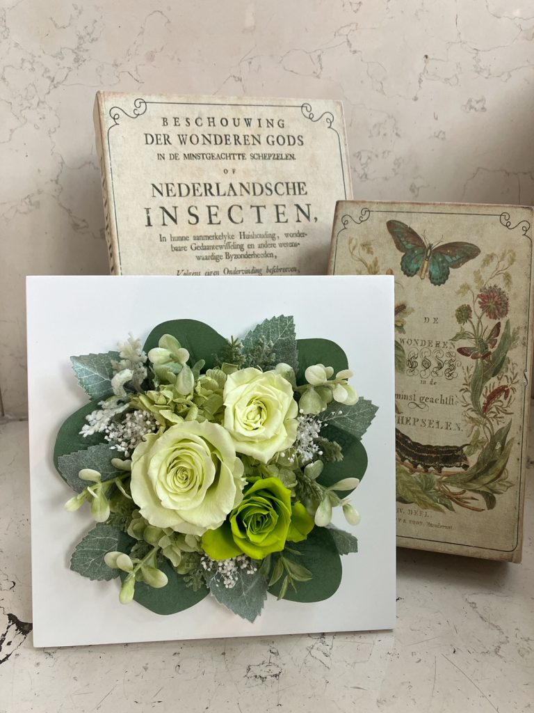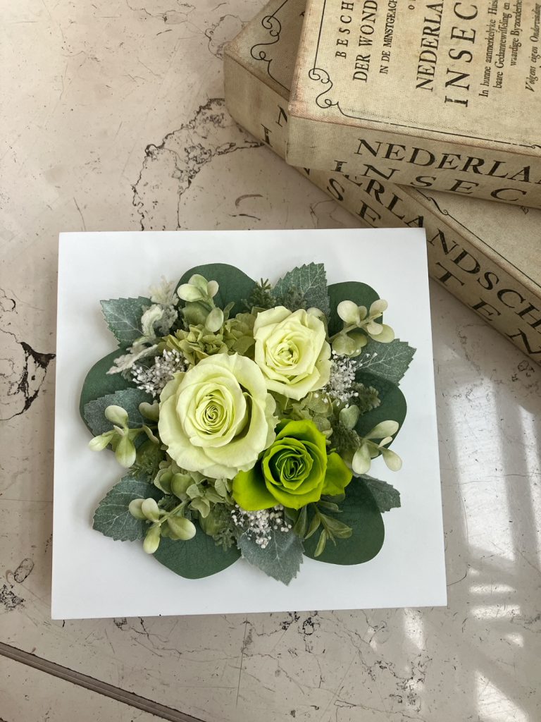 白のウッド調のフレームにプリザーブドフラワーをあしらった、
