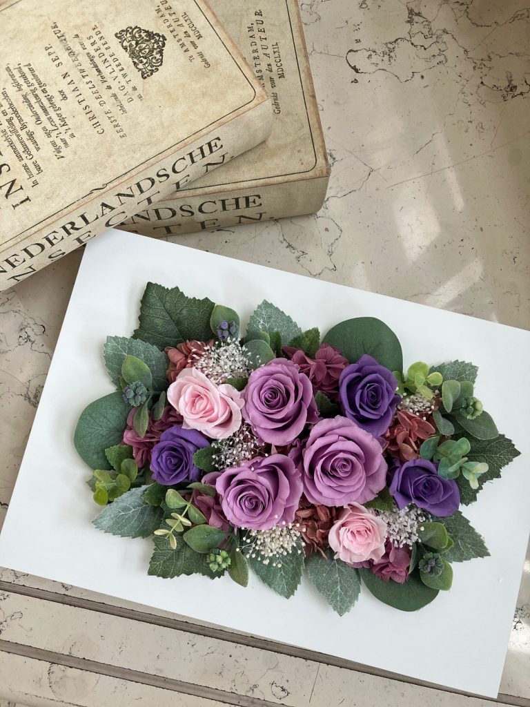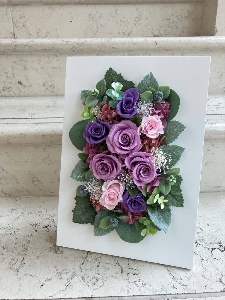 白のウッド調のフレームにプリザーブドフラワーをあしらった、