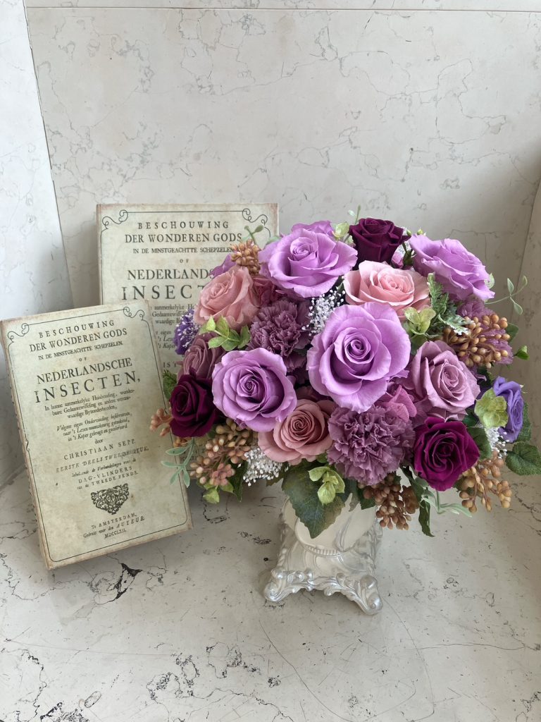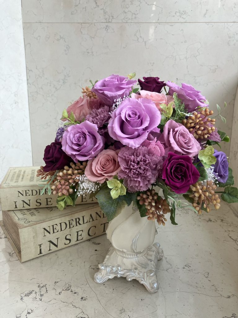 豪華な装飾の器に、 バラやアジサイ、カーネーションなどのプリザーブドフラワーを ふんだんに使用した ラグジュアリーなアレンジメントです。